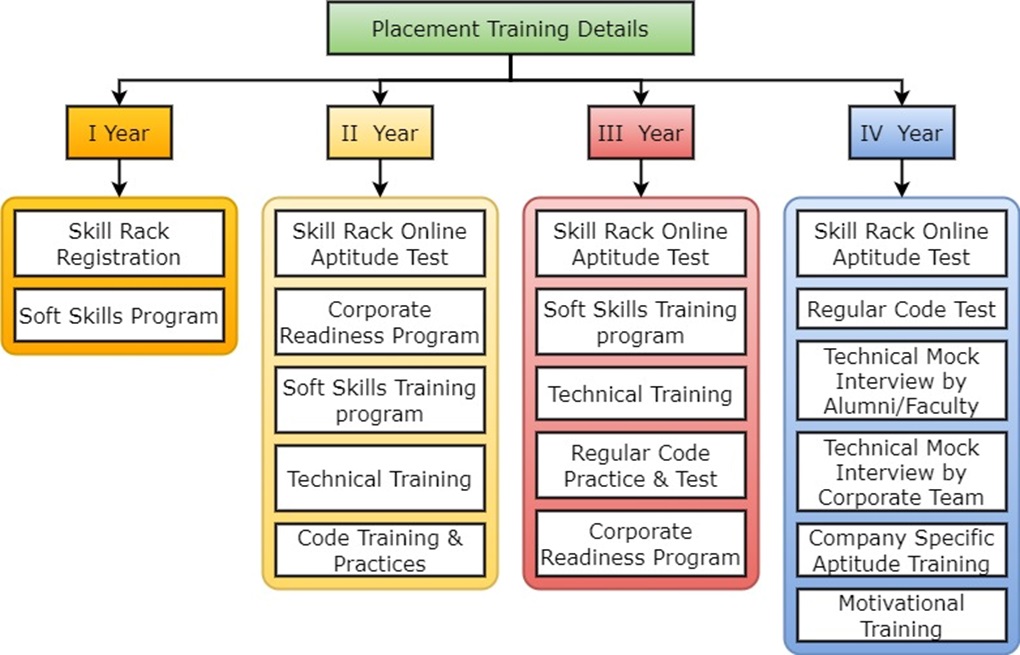 • Corporate readiness program, soft skills training, aptitude training, technical training (Department specific), code training practice for all third-year students.