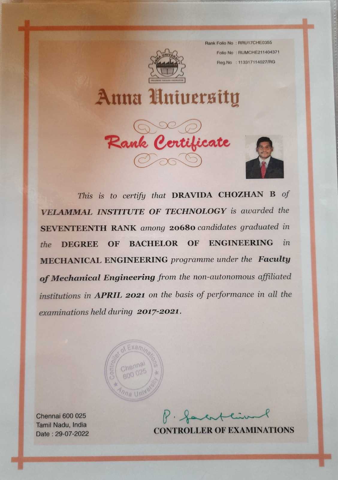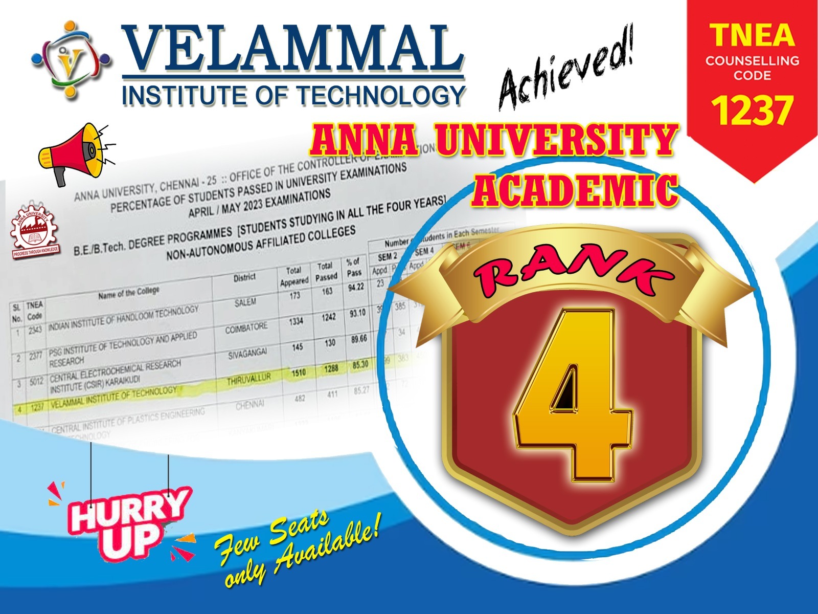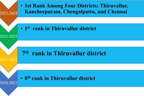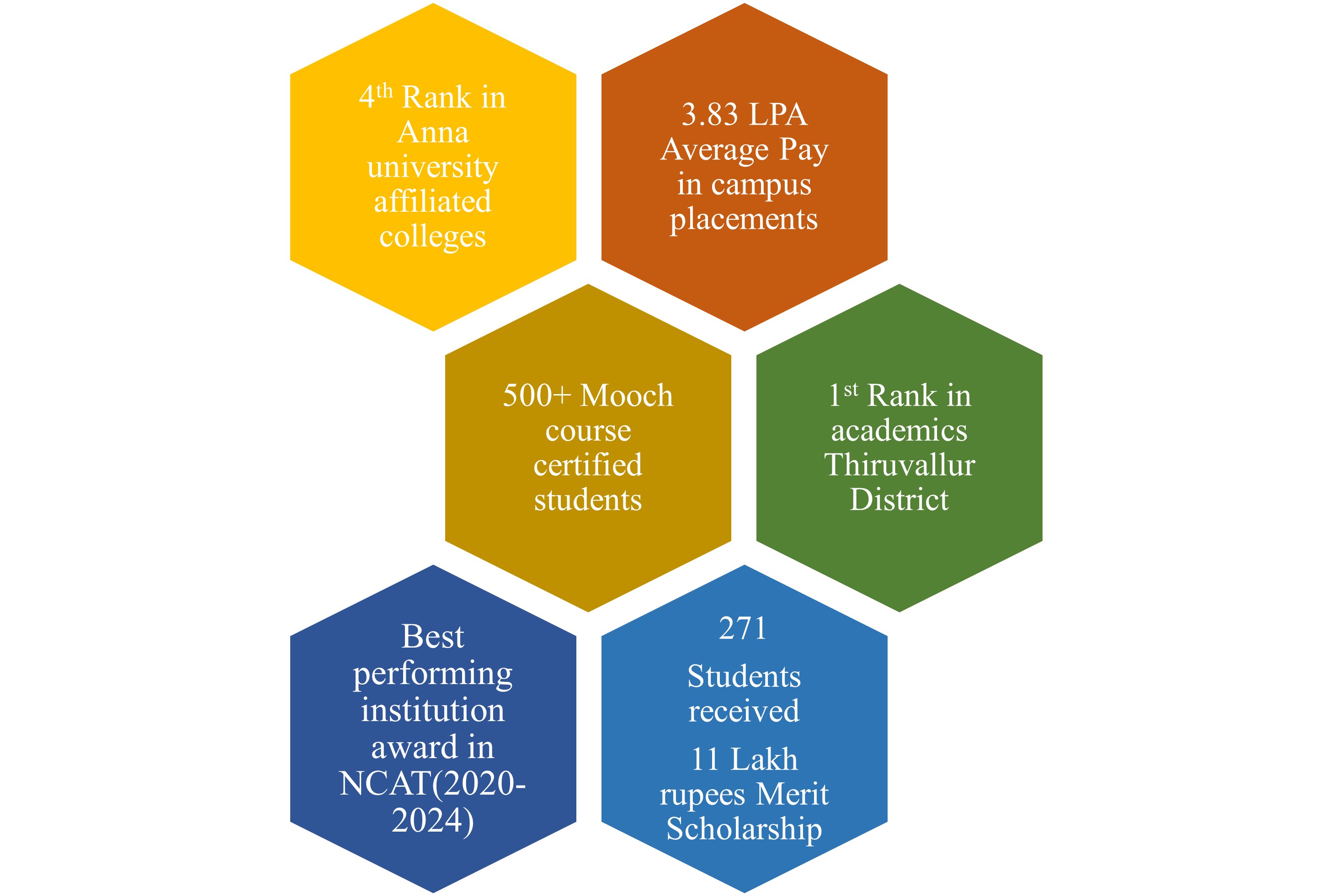 - April/May and November/December 2022: 5th position each semester among 313 non-autonomous affiliated engineering colleges 1st rank in Thiruvallur district.