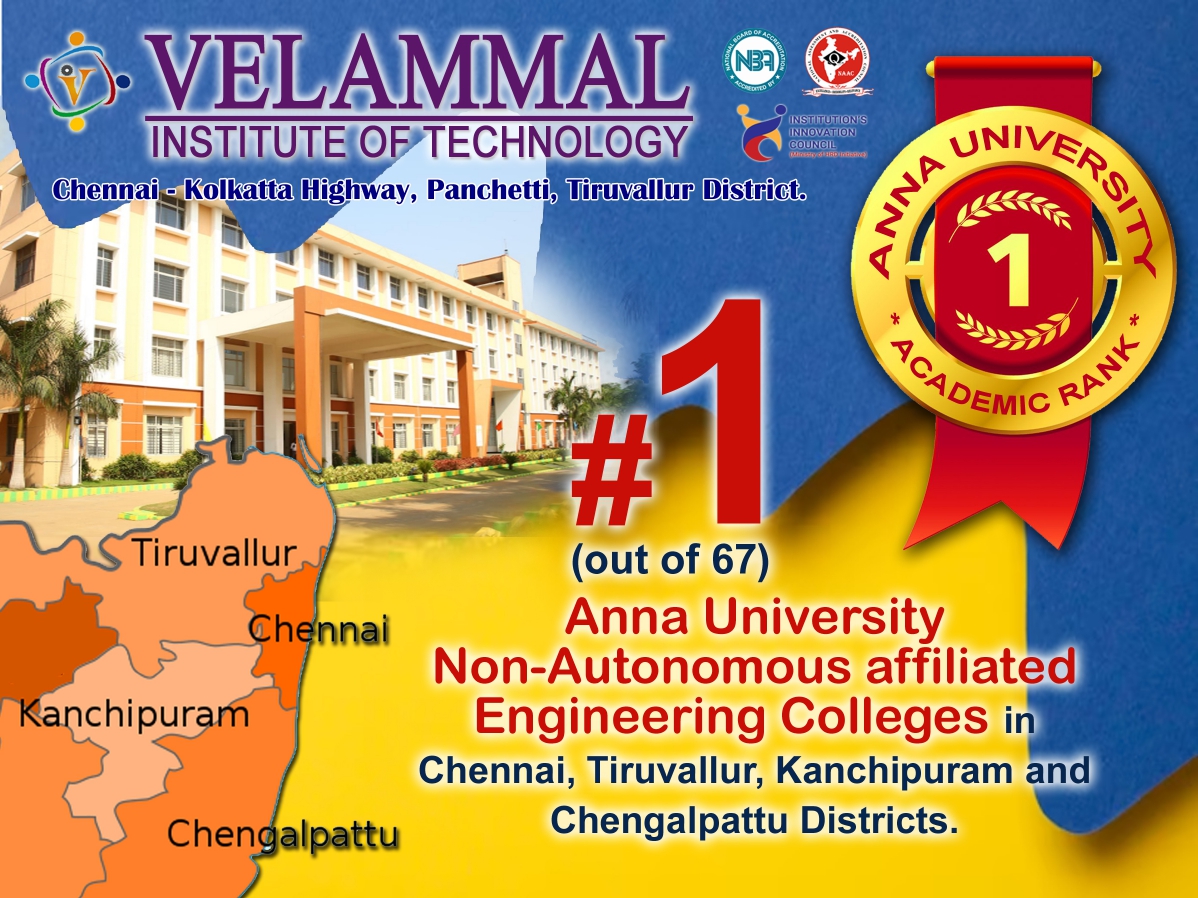 - Velammal Institute of Technology, located at “Velammal Knowledge Park” on the Chennai-Kolkata Highway in Ponneri, Thiruvallur district, is approved by AICTE, New Delhi, and affiliated with Anna University, Chennai. With CSE, ECE, and IT departments accredited by NBA, our institute is dedicated to providing excellent education and service orientation.